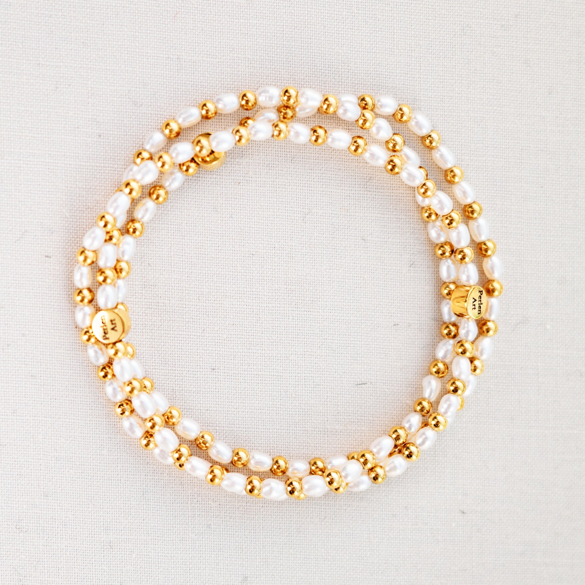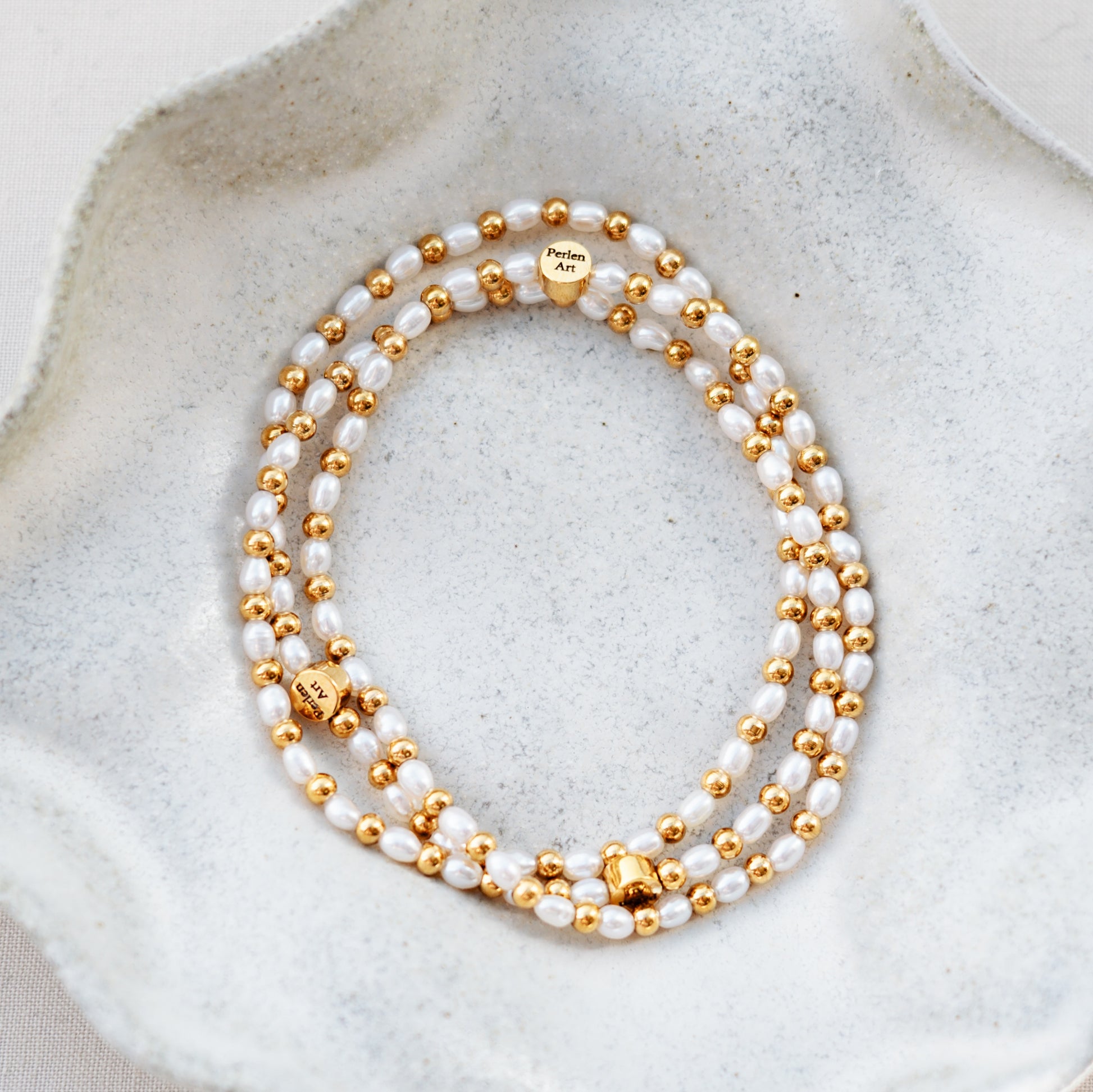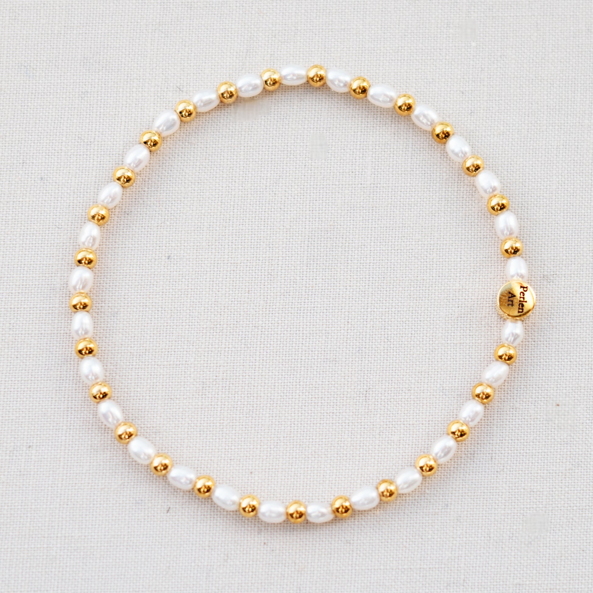 Die gelbgoldenen Perlen in 3mm sind aus wasserfestem Edelstahl. Die echten Süsswasserperlen sind je ca. 3-4mm lang und haben eine Reisform.